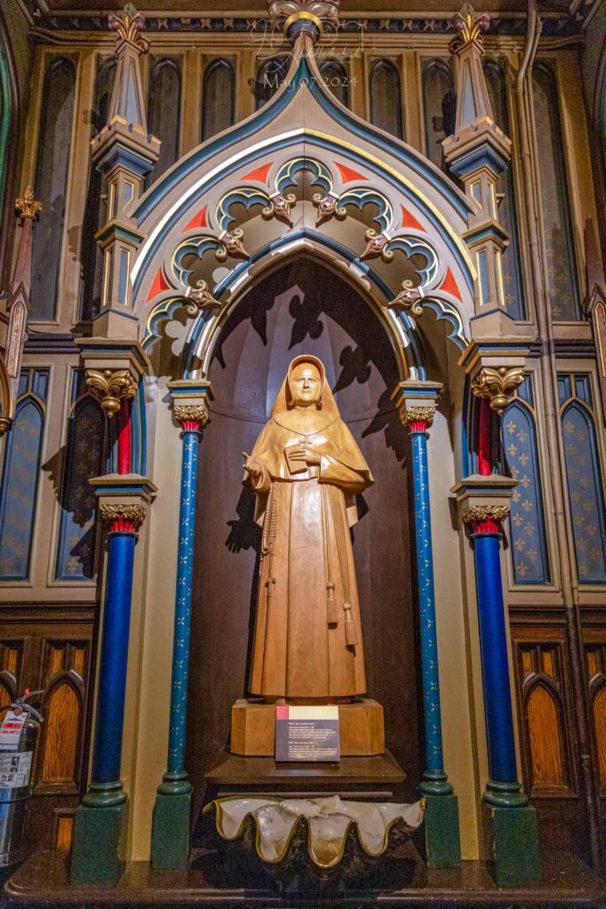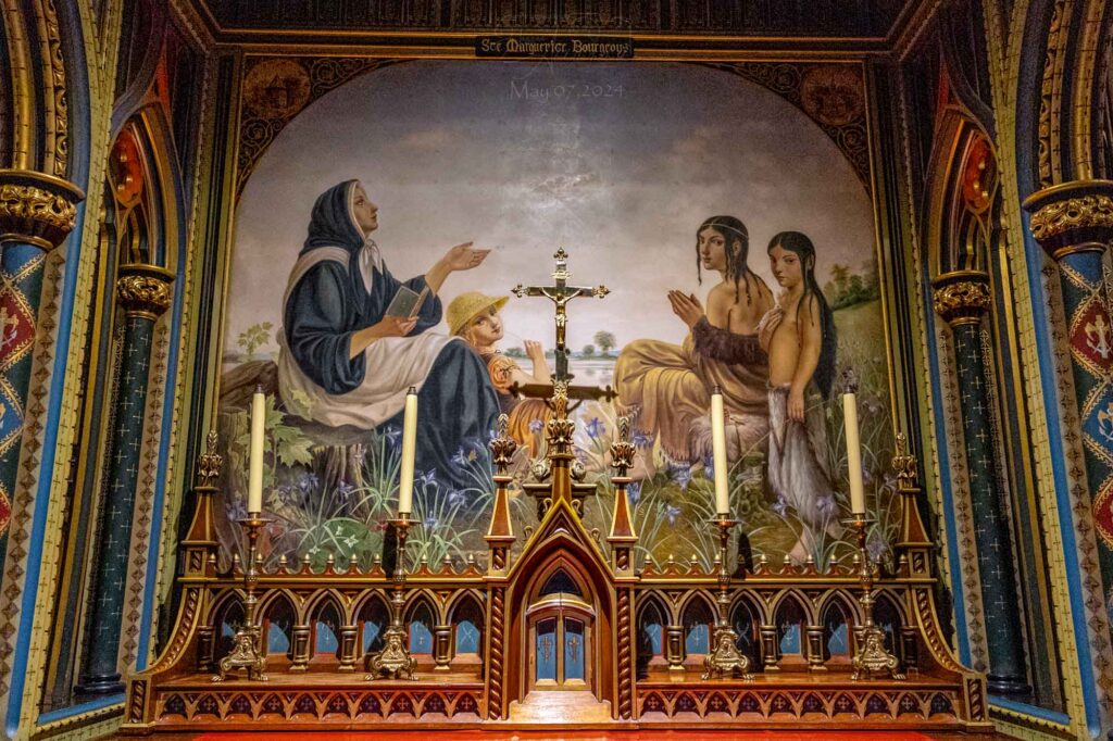 The vaults are coloured deep blue and decorated with golden stars, and the rest of the sanctuary is decorated in blues, azures, reds, purples, silver, and gold. It is filled with hundreds of intricate wooden carvings and several religious statues. Unusual for a church, the stained glass windows along the walls of the sanctuary do not depict biblical scenes, but rather scenes from the religious history of Montreal.