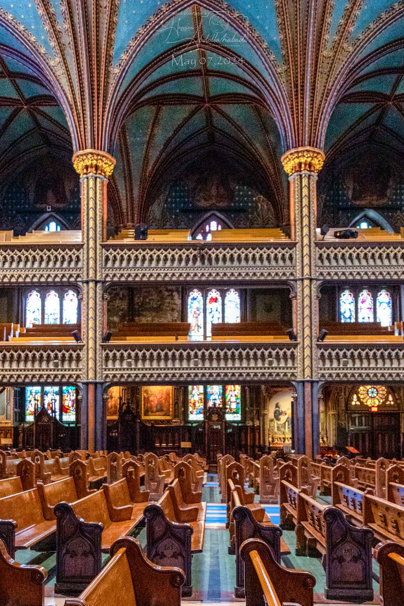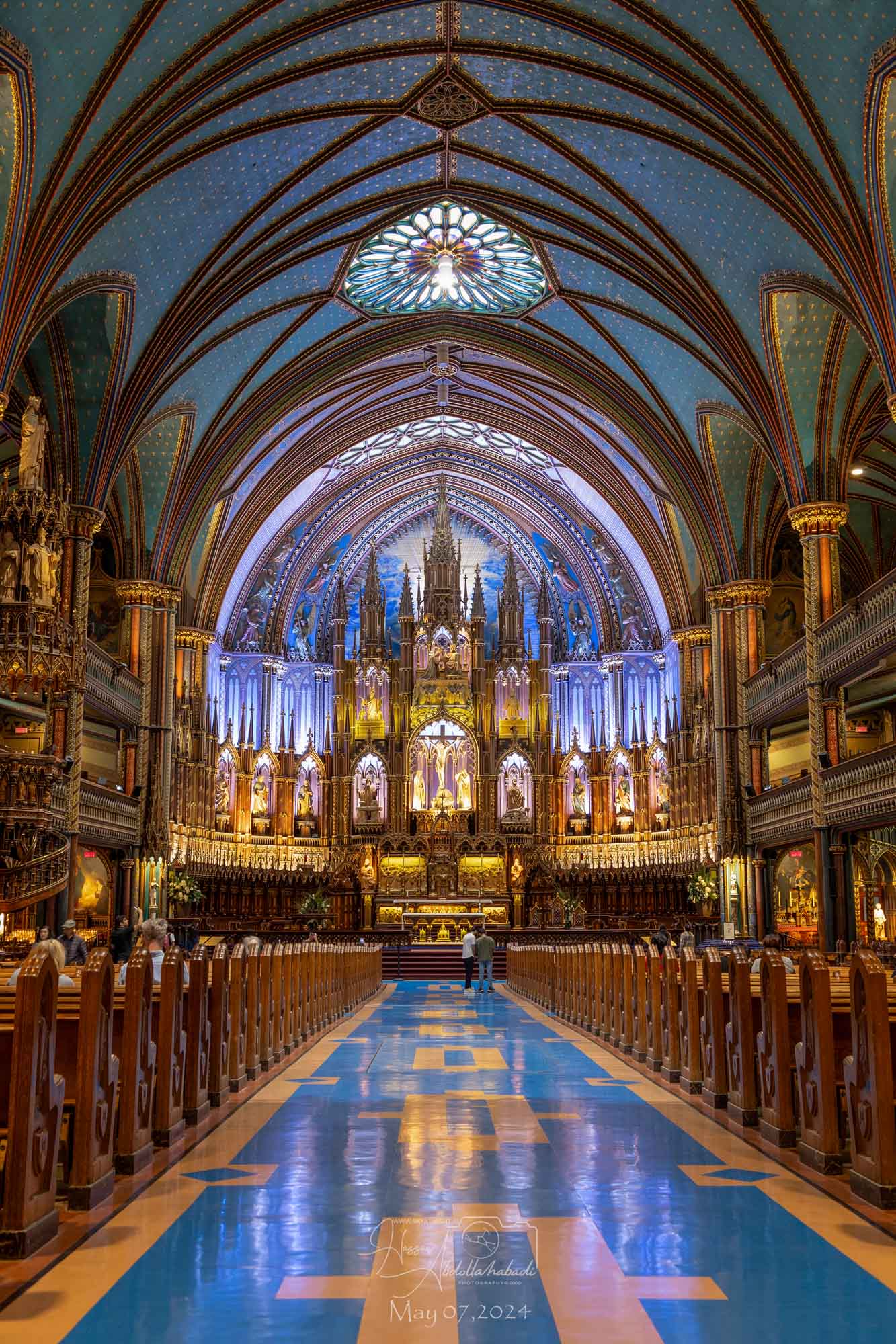 فضای داخلی کلیسا از جمله دراماتیکترین کلیساهای جهان است و به عنوان شاهکاری از معماری احیای گوتیک شناخته میشود. طاقها به رنگ آبی تیره رنگآمیزی شده و با ستارههای طلایی تزئین شدهاند و بقیه محراب با رنگهای آبی، لاجوردی، قرمز، بنفش، نقرهای و طلایی تزئین شده است. این کلیسا مملو از صدها حکاکی چوبی پیچیده و چندین مجسمه مذهبی است. برخلاف یک کلیسا، پنجرههای شیشهای رنگی در امتداد دیوارهای محراب صحنههای کتاب مقدس را به تصویر نمیکشند، بلکه صحنههایی از تاریخ مذهبی مونترال را به تصویر میکشند