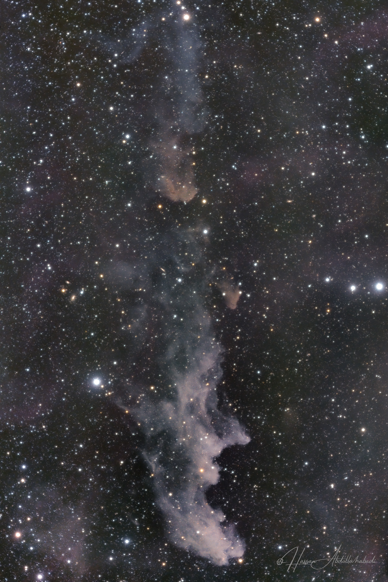 By starlight this eerie visage shines in the dark, a crooked profile evoking its popular name, the Witch Head Nebula.